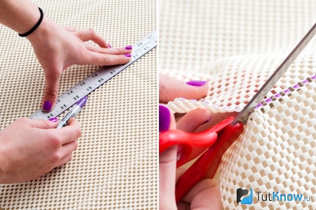 Практически любой коврик можно сделать нескользящим. Для этого приобретите в строительном магазине противоскользящую сетку, она должна быть немного прорезиненной. Отрезаем сетку чуть меньшего периметра, чем наш коврик и подстелив под него. Сетку даже можно не приклеивать, она будет держаться и без клея. А стирать эти два элемента отдельно.