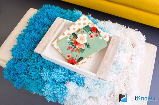 После того как вы прикрепите их все, у вас получится вот такой красивый коврик из помпонов.