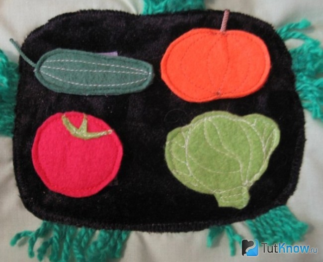 Из кусочков разных цветов, соответствующих конкретному фрукту, овощу, вырежьте их. С обратной стороны пришейте липучку и разместите аппликацию на коврике. Тогда малыш сможет отрывать тканевые фрукты и овощи и крепить их на другое место половичка.
