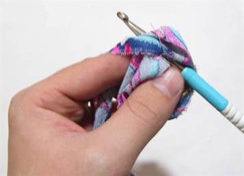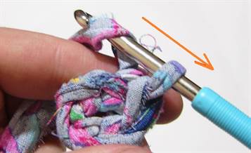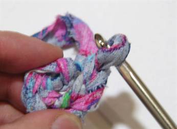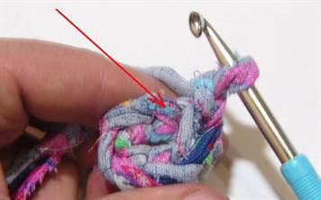 В этом случае ленты из футболок останутся внутри петель из пряжи. Думаю, что принцип такого вязания понятен будет по фото.