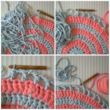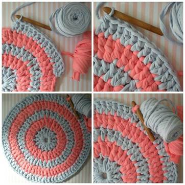 И второй вариант вязания ковриков из футболок – такой же как и при вязании корзинок с использованием обычной пряжи для вязания.