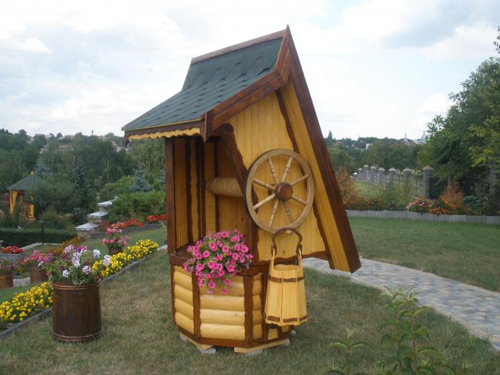 Открытые колодцы традиционны для деревень, они особенно удобны, если ими пользуются несколько хозяев. Устоялись определенные правила их оформления. Умельцы украшают их резьбой, фигурными козырьками.