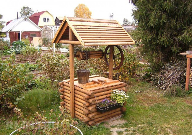 Если на участке пробурена скважина, или установлен резервуар с питьевой водой и насосом, их также можно оформить в виде практически настоящего «колодца», из которого тоже можно набрать воды, правда, не из шахты, а из крана.