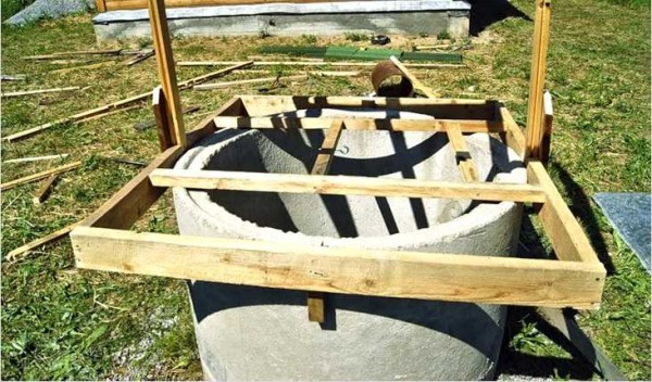 Первоначально потребуется собрать деревянный каркас, который будет использоваться в качестве опоры на бетонном кольце. Для этого можно использовать брус или доску-сороковку. В центральной части квадратной рамы устанавливается двойная распорка, с помощью которой можно увеличить жесткость опорного короба и повесить крышку, закрывающую зеркало воды.