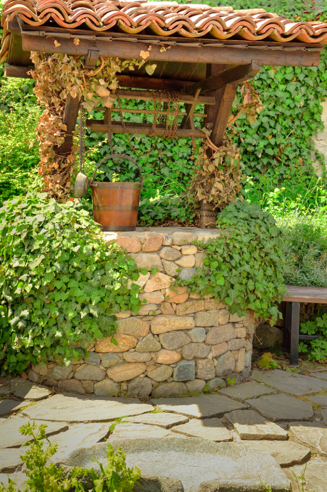 В сочетании с вьющейся зеленью колодец способен стать настоящим украшением подворья загородного дома.