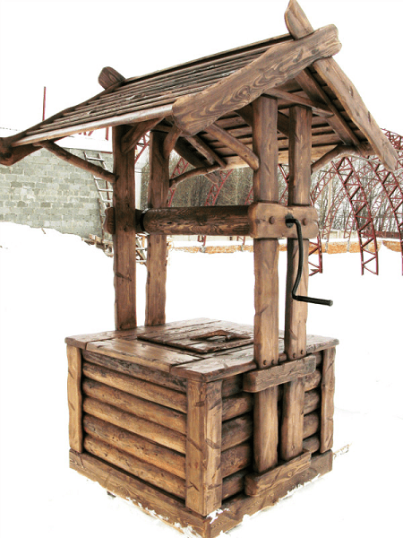 - Главные колодезные детали — деревянные ворот и стойки не рассыхаются и не лопаются под действием солнечных лучей.