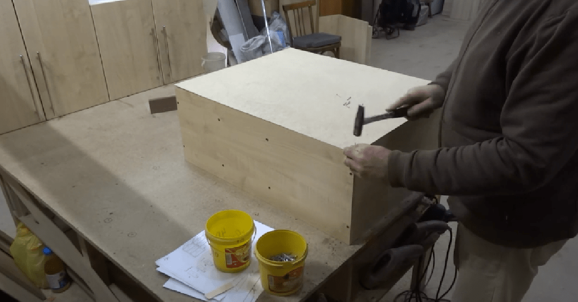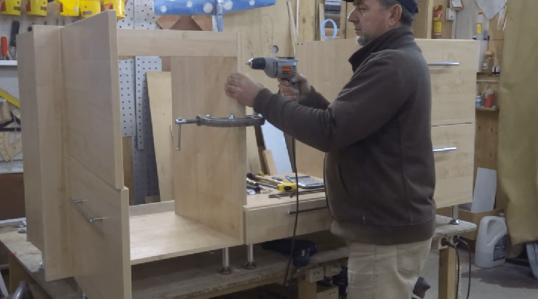 Когда все готово, можно приступать к работе, начинайте с нижних тумбочек или ножек. Части скреплять между собой необходимо евростяжками специальными саморезами, под которые предварительно просверливают отверстия. Детали собираются как коробка, на горизонтальную поверхность закрепляют боковые стенки.