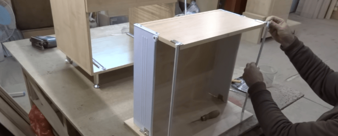 Начинать установку с крайней тумбы или же с угловой если имеется угол. При помощи стяжек прикрепляйте следующие тумбы к предыдущим. Для равномерности используется уровень. После того, как собрана вся конструкция поверх устанавливается одна цельная столешница. Ее следует закрепить используя саморезы. На цельной столешнице при помощи лобзика вырезаются отверстия под раковину.