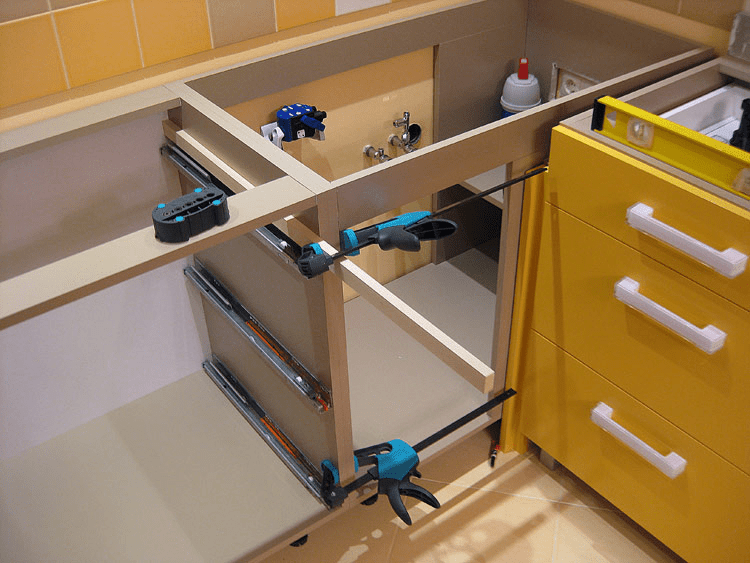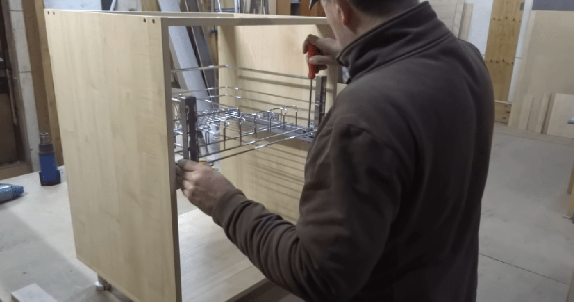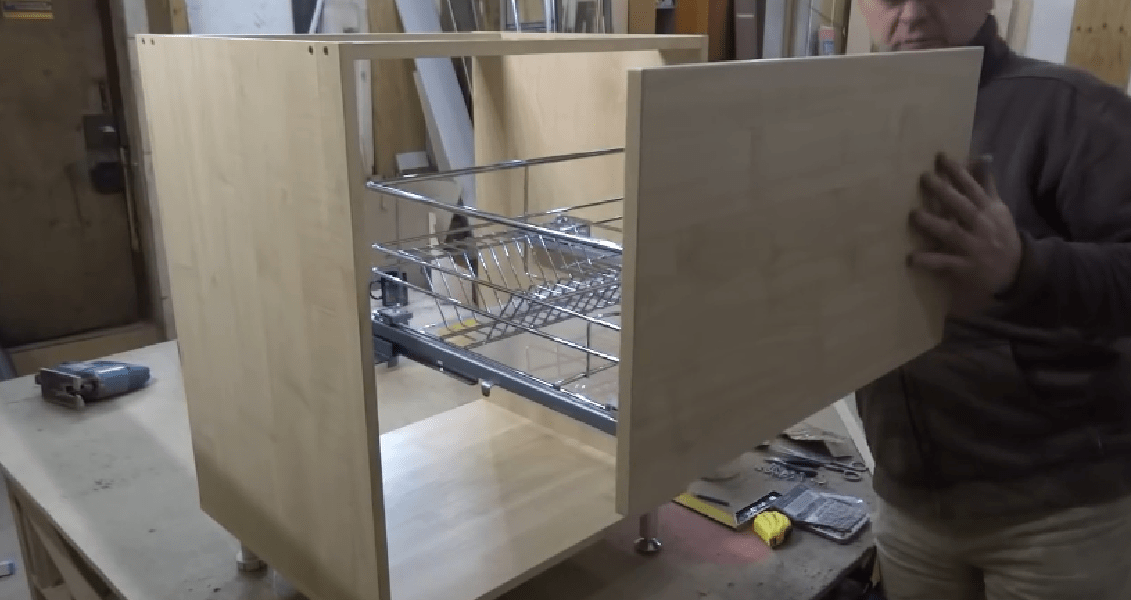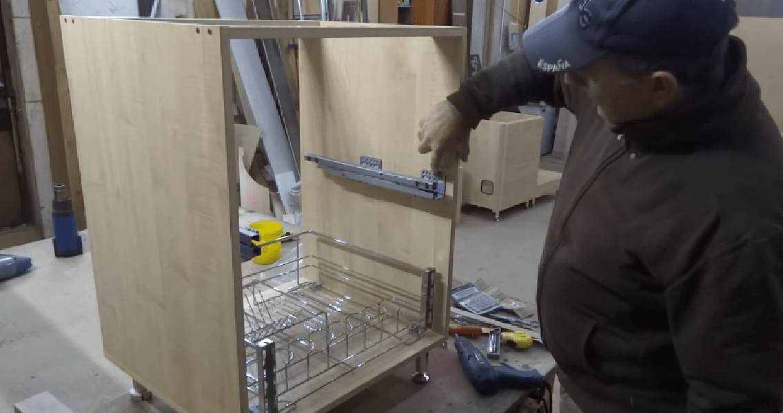 - Прикрепите направляющие, если в шкафу есть ящики. Убедитесь, что вы используете уровень, иначе результат будет плачевным, и вы просто не откроете шкафчик.