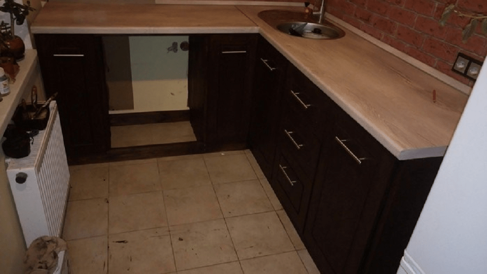 - Изготавливается и накладывается столешница, устанавливается оборудование – плита, мойка, сушилка, микроволновка, стиралка, посудомойка, индукционная варочная поверхность или что там у вас еще;
