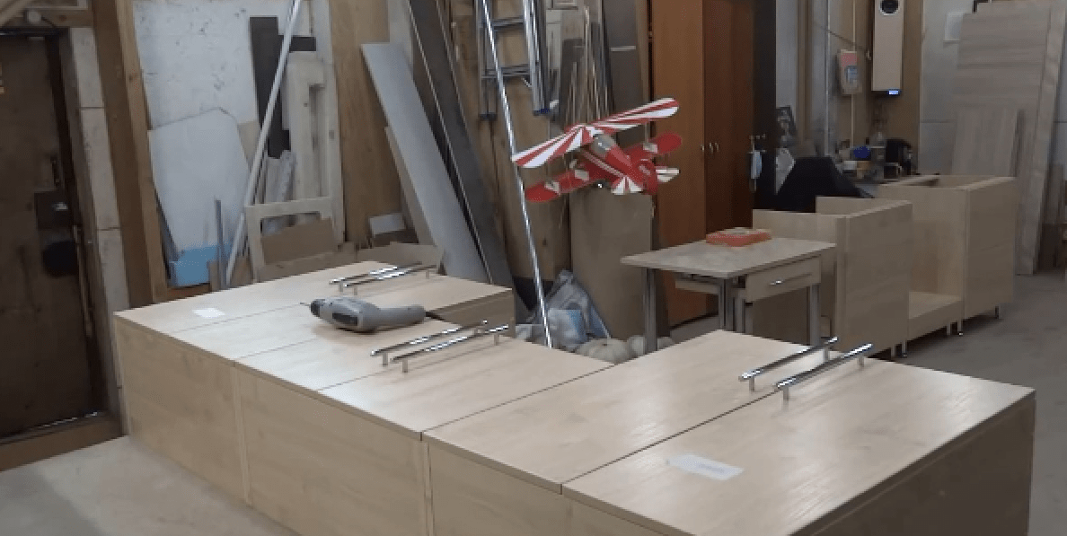 - Детали вырезаются и собираются в «коробки», модули/секции без дверец – фасадов – остекления, полок и ящиков;