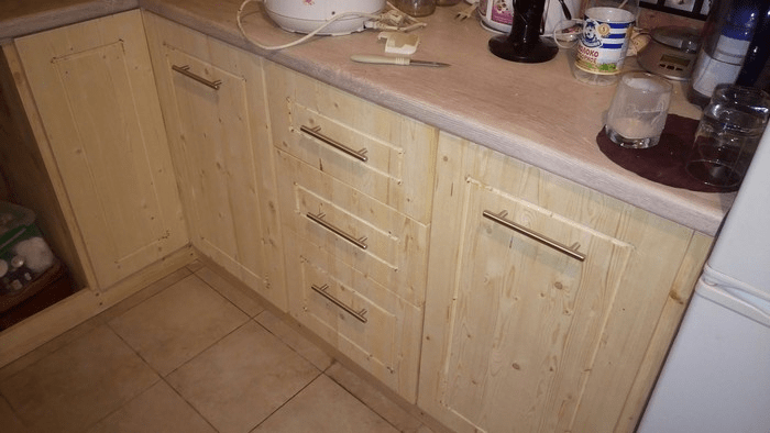 Например, сосновая кухня – довольно недорогой вариант, но и у него есть много недостатков. Итак, сосновый гарнитур своими руками не такой прочный, как ДСП. Сосна – материал мягкий, на ней часто остаются вмятины и следы механических повреждений. К тому же древесина сосны не имеет ярко выраженного рисунка.