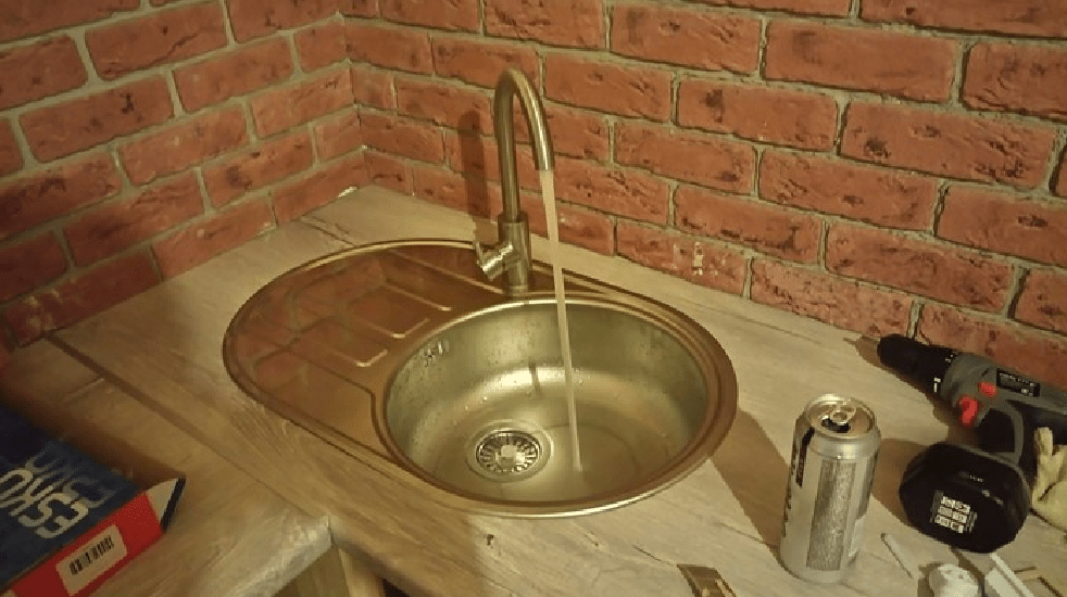 Прикрепите столешницу с предварительно вырезанными отверстиями под мойку и варочную панель или варочную панель к навесным шкафам с помощью саморезов. Отверстия мойки и варочной панели необходимо заделать строительным герметиком. Не жалейте его, он защитит древесину от влаги.