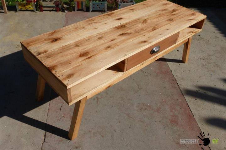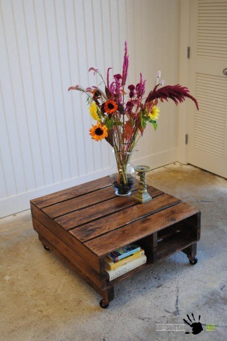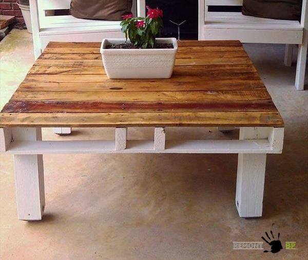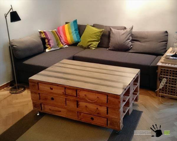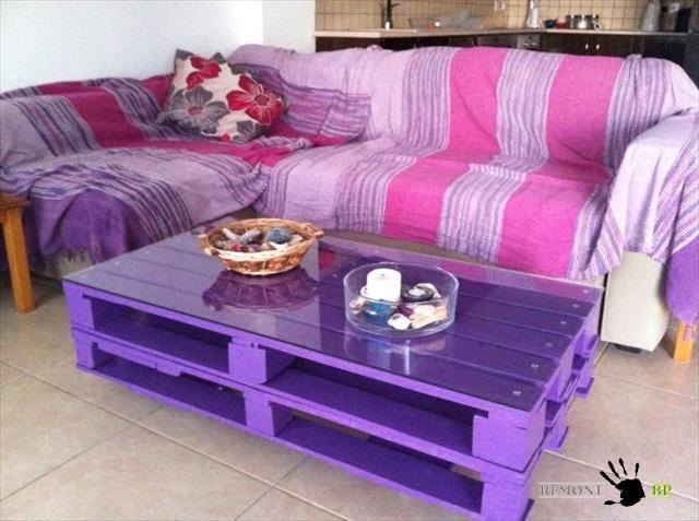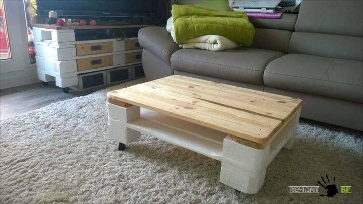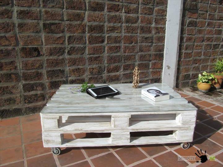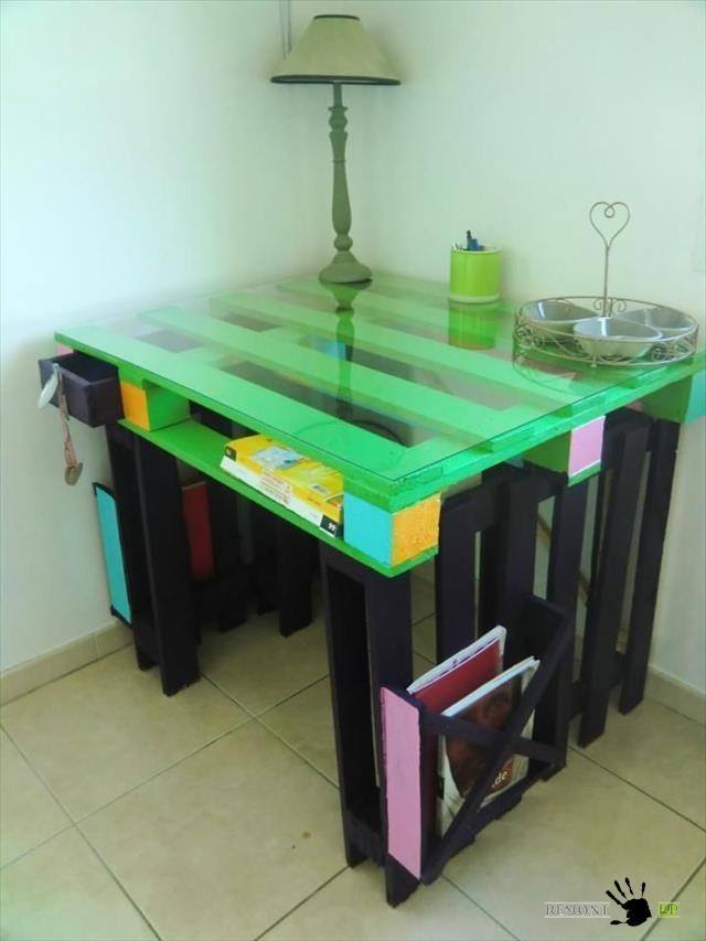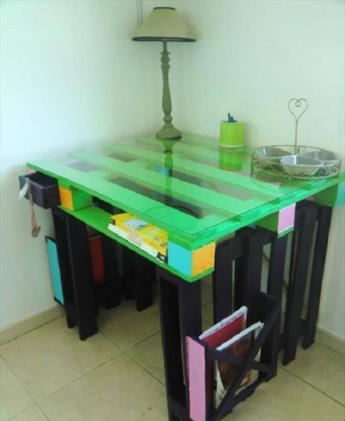 Можно сделать столик из одного паллета, приделав к нему колёсики. Можно положить на грубое, почти не обработанное дерево стеклянную столешницу или поставить паллет на изящные ножки и сыграть на контрасте. Можно обработать паллеты ну, очень тщательно и покрасить их в такие гламурные цвета, что бывший строительный мусор в этом столике точно никто не узнает.