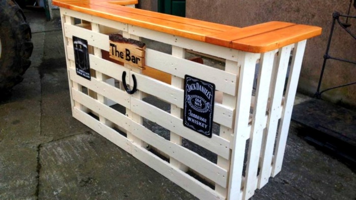 Помимо столов классических форм, паллеты применяют для оформления барной стойки или просто высокой подставки. Иногда их дополняют простыми высокими стульями. Такое исполнение мебели из паллетов встречается при обустройстве загородного участка.