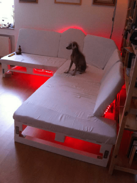 - Как и в случае с диванами, внести в интерьер нотку оригинальности поможет цветная подсветка мебели из паллетов.