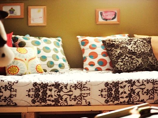Диваны могут быть не только в стандартном «книжном» варианте, но иметь и угловые формы. - Яркие подушки или матрасы,
