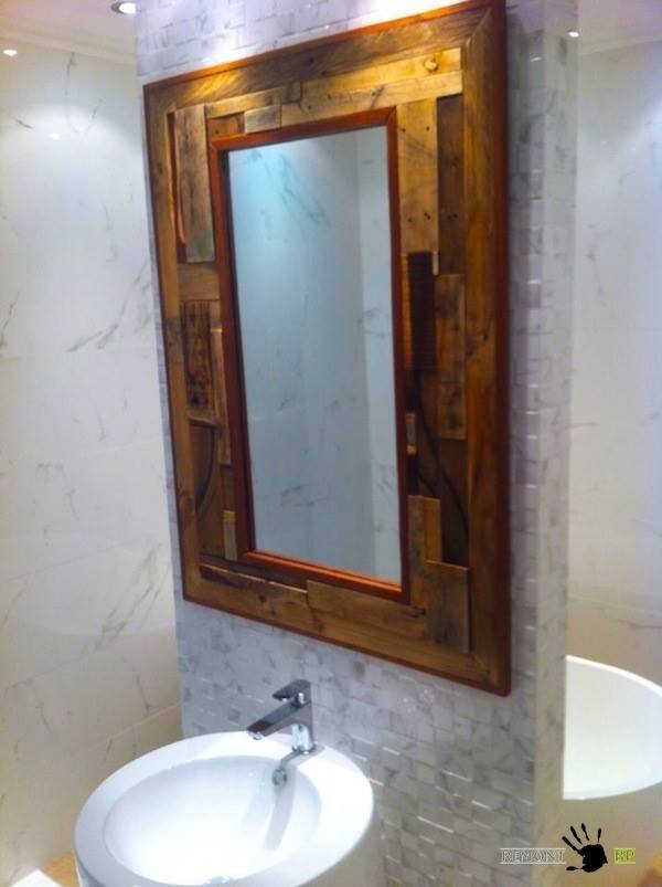 Не собираетесь делать из паллет всю кровать целиком? Сделайте стильное изголовье! Превращаются поддоны и в неожиданные детали интерьера: сотовое зеркало, например (укрепите зеркальные полоски в «щелях» поддона).