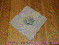 Лоскут ткани кладется лицевой стороной вниз. В один из уголков вкладывается комочек наполнителя размером около 1,5 см в диаметре. Цветной контрастной нитью уголок обвязывается вверху так, чтобы остался небольшой хохолок. Нить пропускается через середину наполнителя, под тканью, складки ткани расправляются, и этой же нитью обвязывается шарик снизу.