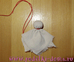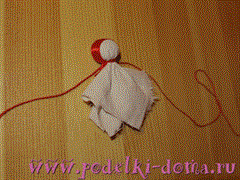 Оставшиеся уголки белой ткани подвязываем вокруг туловища ниткой на поясе. В зависимости от натяжения ткани, определяем направление рук. Они могут быть широко распахнуты или слекга опущены вниз.