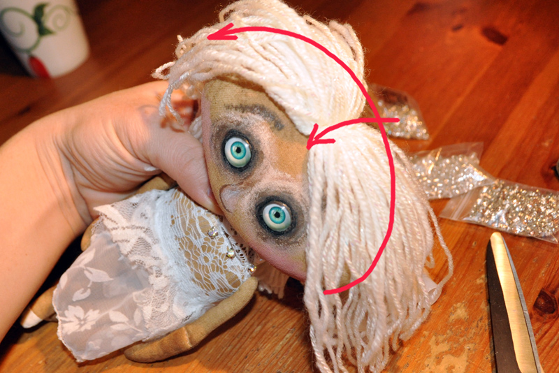Пришиваем парик к голове куклы вдоль шва и поперек головы по линиям, показанным на рисунке.