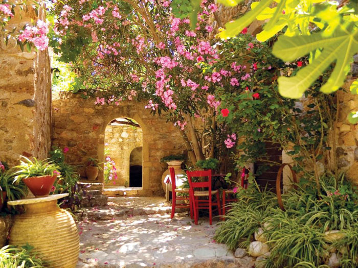 И наоборот, если вы располагаете большой площадью участка, то ее можно зонировать, воплощая в жизнь разные тематические уголки. Например, деревенский стиль предполагает использование простых конструкций в дизайне. Он сочетается с декором ручной работы, гравийными дорожками и деревянными настилами.