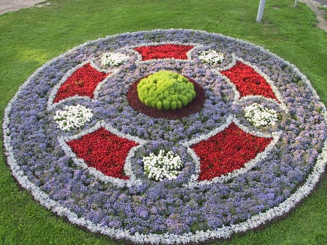 - регулярные – в такие клумбы высаживаются разные растения, цветущие в определенный период времени, но располагаются в виде некоторого рисунка;