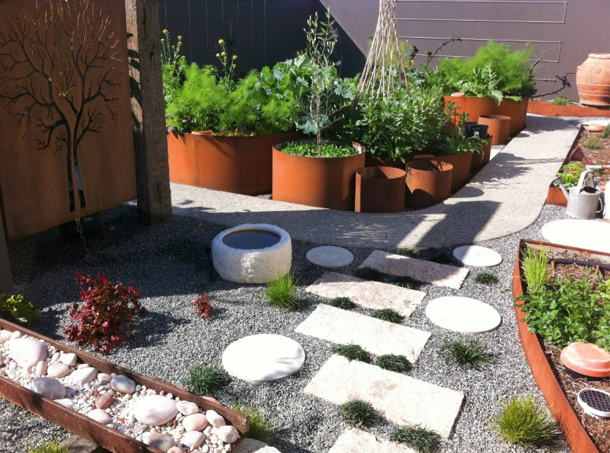 Такой из разных по величине емкостей вносит в сад разнообразие и благодаря своему компактному размеру подходит даже для самого маленького участка.