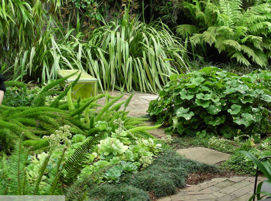 Причем пространство между тропками занято растениями — открытым остается только уголок для отдыха. Благодаря подобным приемам сохраняется иллюзия масштабности сада.