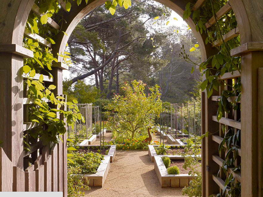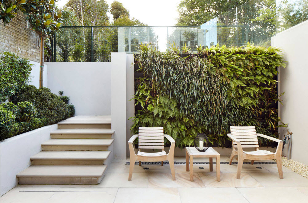 : Покрытые зеленью опоры для растений, например и перголы, создают вертикальные структуры и причудливую игру теней — пространство становится объемным. Низкая живая изгородь из еще и делит участок на две части.