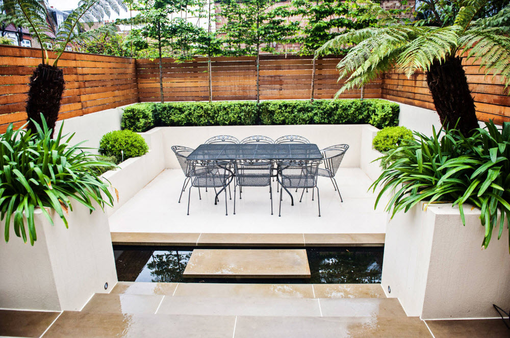 На небольшом участке можно поместить даже декоративный . Понятно, что водоем будет небольшим, но даже такой поспособствует нужному оптическому фокусу. Спокойная водная гладь, словно зеркало, отражает на своей поверхности небо, облака и все то, что находится вокруг пруда. Благодаря такому эффекту сад кажется больше, чем он есть на самом деле. На руку играет и вытянутая прямоугольная форма водоема: эта конфигурация визуально удлиняет участок.