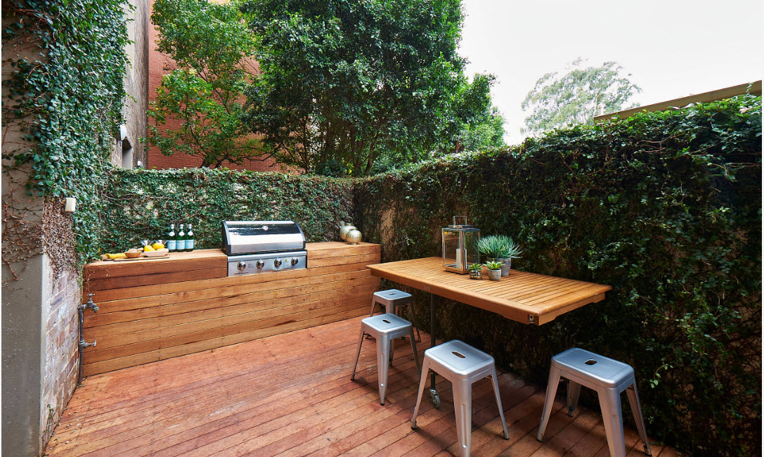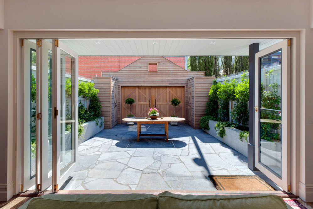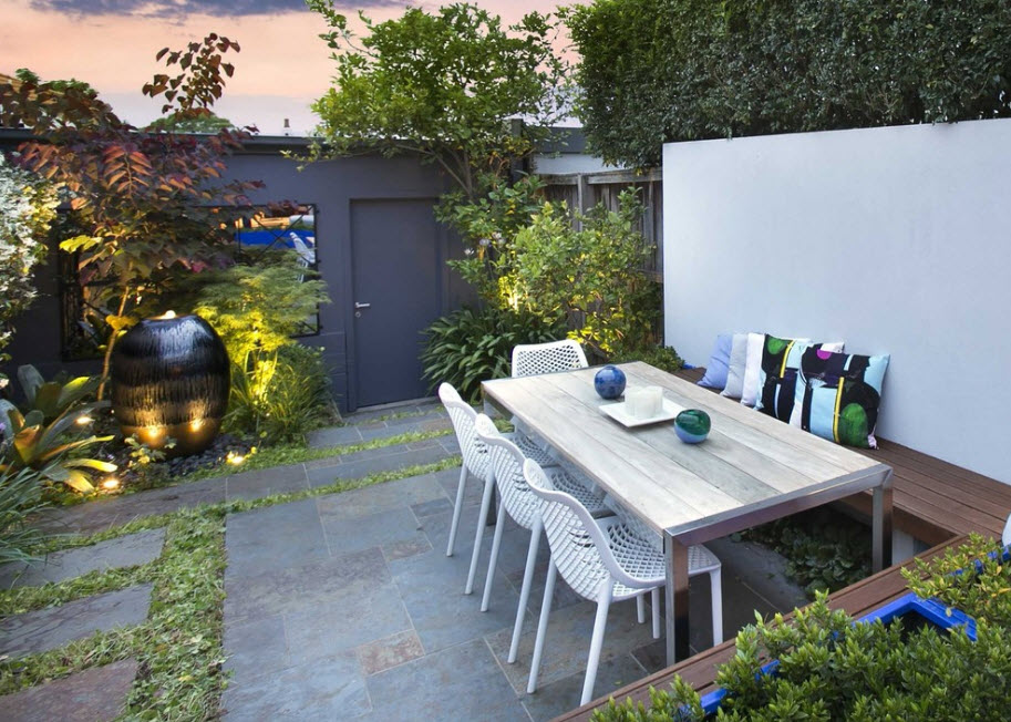 Стиль прекрасно подойдет занятым людям как раз из-за своей лаконичности, здесь просто не придется долго вздыхать над грядкой или клумбой из-за их малочисленности и наличия технических приспособлений для полноценного ухода.