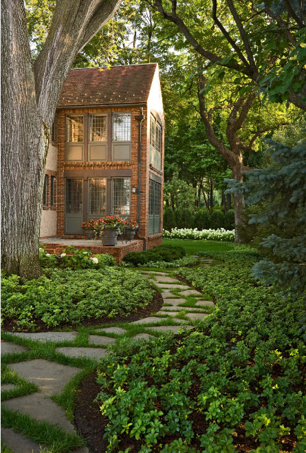 Тропинки, помимо своей прямой функции сообщения различных участков сада, также выполняют ряд других функций – зонирование, украшение территории. Дорожки могут быть монолитными, насыпными и мощеными. Для их сооружения используются самые разные материалы в зависимости от бюджета и выбранного стиля: