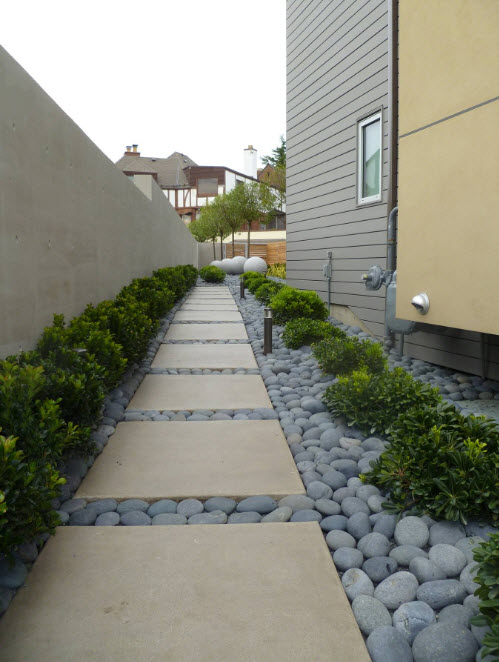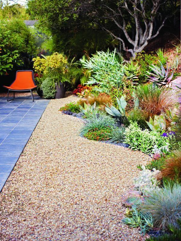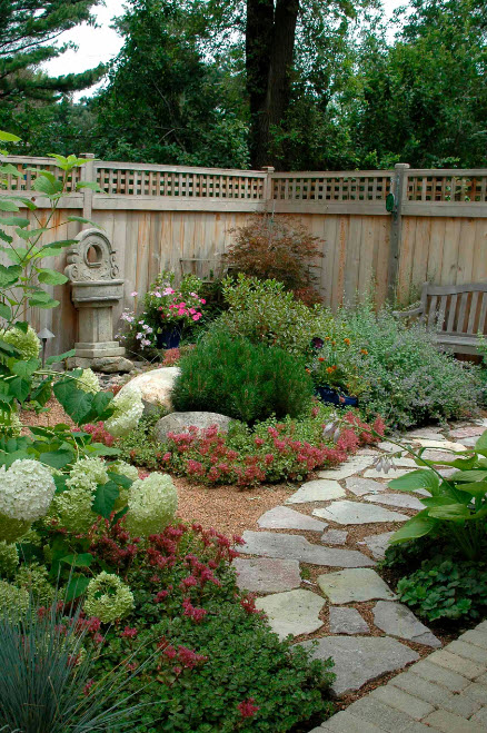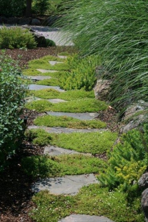 Всем остальным вариантам больше подойдут слегка запутанные, извилистые тропки, которые, к тому же, добавят участку дополнительное пространство, пусть лишь визуальное.