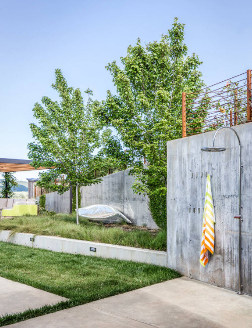 Хай-тек имеет сходства с минимализмом, но в нем используется больше технологичных решений. Для оформления ландшафта можно применять все современные материалы – бетон и стекло, металл и качественный пластик, полированное дерево. Красочные клумбы и цветники почти не используются, вместо этого создаются посадки деревьев и кустарников, которые формируют при помощи обрезки и придают им четкую геометрическую форму.