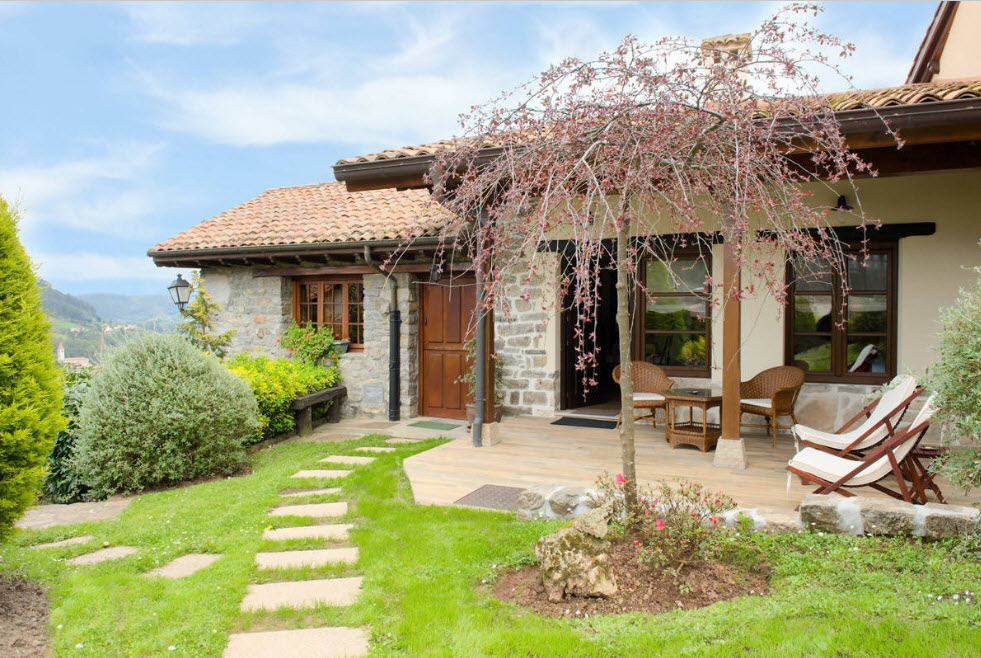 Деревенский кантри. В основе стиля лежит простота, естественность, нарочитая небрежность и хаотичность. Для оформления ландшафта нужно использовать природные материалы – к примеру, для дорожек – натуральный камень, между которым поросла трава, для заборов, лавочек – натуральную древесину. На клумбах высаживать можно полевые и дикие цветы, совмещая с культурными видами. Для декора участка можно использовать подручные предметы быта – корзинки, тележки, глиняные вазоны и горшки и пр. Использовать для озеленения дорогие, экзотические растения или стелить строгий идеальный газон не стоит. Деревенский кантри прост в реализации для начинающих.