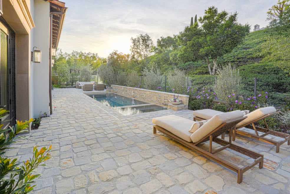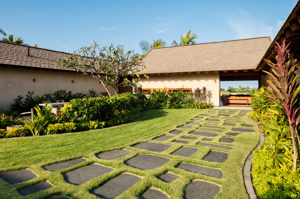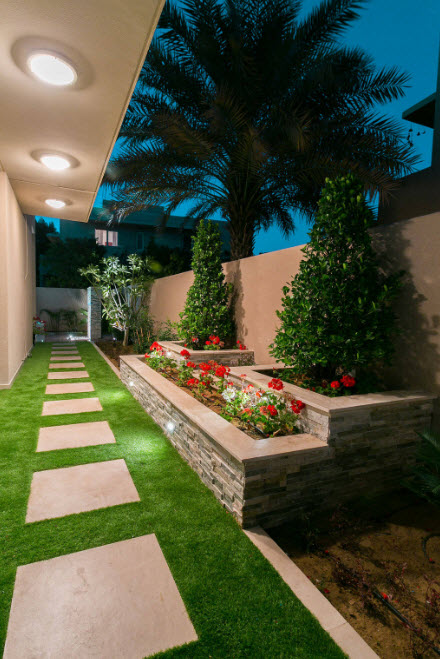 Пышная растительность такого участка наглухо спрятана за каменной стеной, отделяющей участок от остального мира. Красивые фонтаны и неглубокие пруды, ровные линии и правильные формы, элементы восточного орнамента создают впечатление сада богатого эмира.