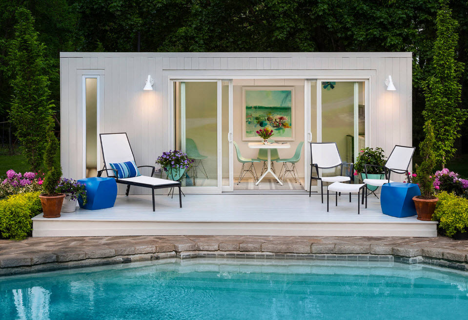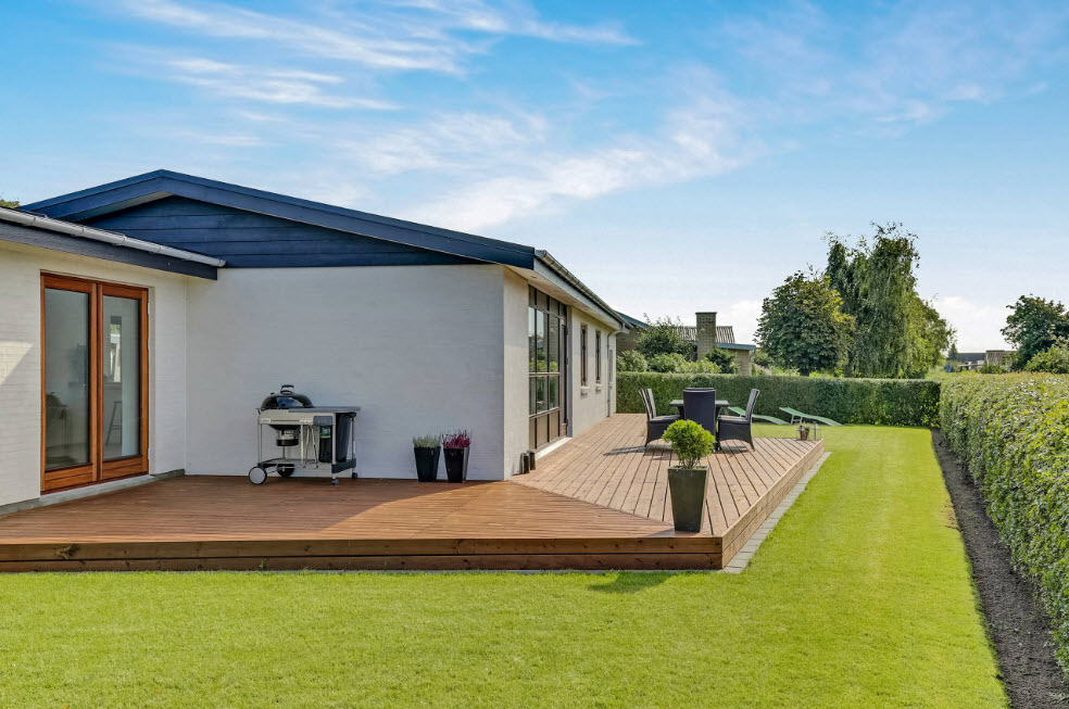 Минимализм довольно сложно реализовать и поддерживать на дачном участке. В оформлении стоит придерживаться прямых линий, для озеленения использовать газоны и аккуратные лужайки. Из цветов лучше выбрать не больше 2-3 разновидностей неярких оттенков (белые, кремовые, пастельные). Элементы декора могут быть выполнены из современных материалов – стекла, металла, пластика.