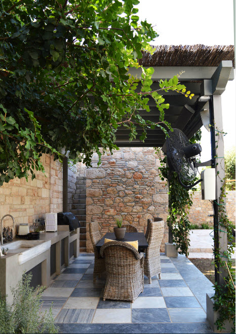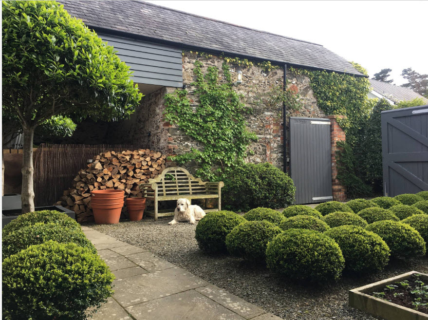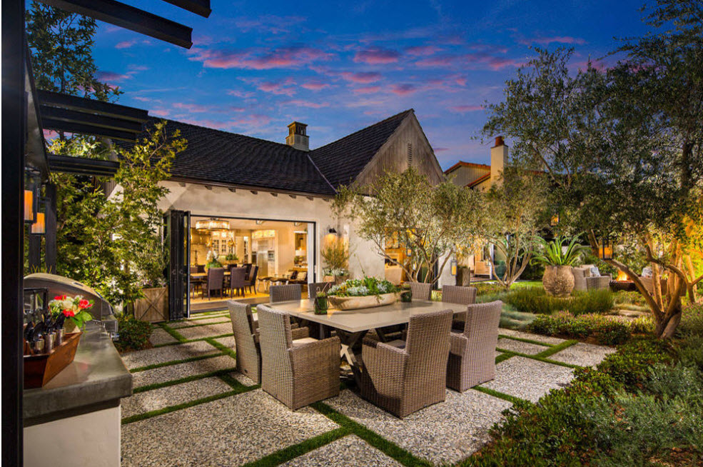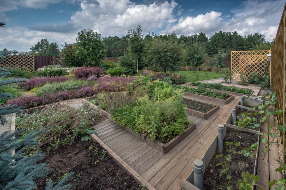 Фруктовые деревья, пряные травы, аккуратные грядки станут практической частью этого дизайна. Дополнят элегантную обстановку предметы садовой мебели, созданной давным-давно, или качественно состаренные элементы, легкие качели, дорожки из гравия.
