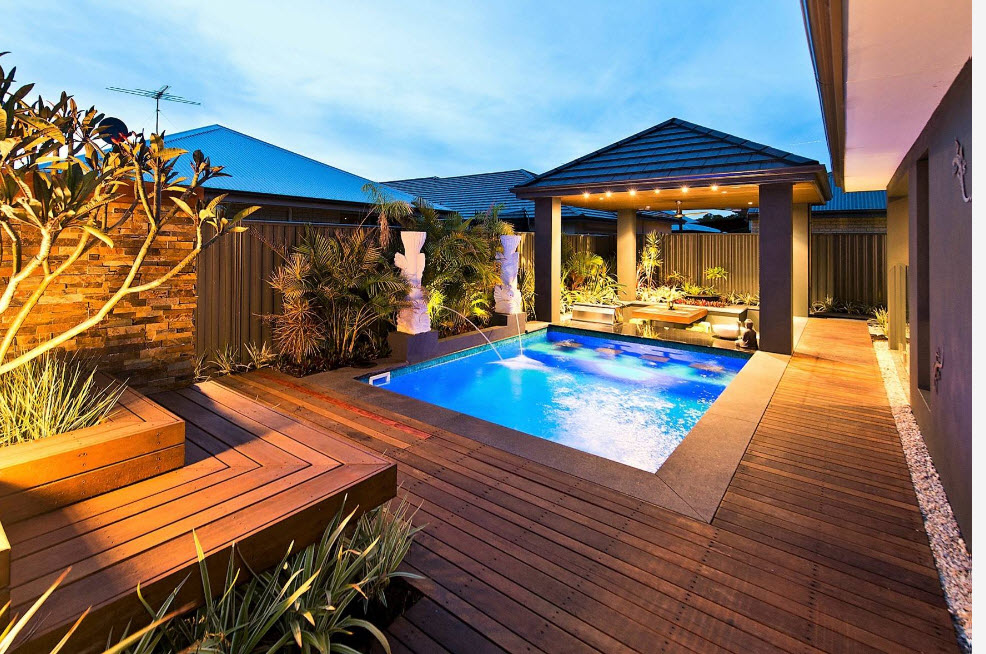 - Для отдыха. В таком случае из построек могут быть бассейн, гараж для авто, беседки и патио. Также можно выделить место под детскую площадку, песочницу. Ландшафт дачи для отдыха может быть дополнен прудом, фонтанчиком или другим искусственным водоемом, различными арками и перголами, живыми изгородями.