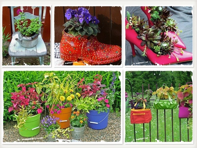 Большое количество разнообразных клумб с самыми разными цветами завершат этот дизайн, причем они не всегда симметричны или правильны по форме. А основанием для них могут служить старые горшки, кастрюли, велосипеды и все остальное, что долго искало своего применения.