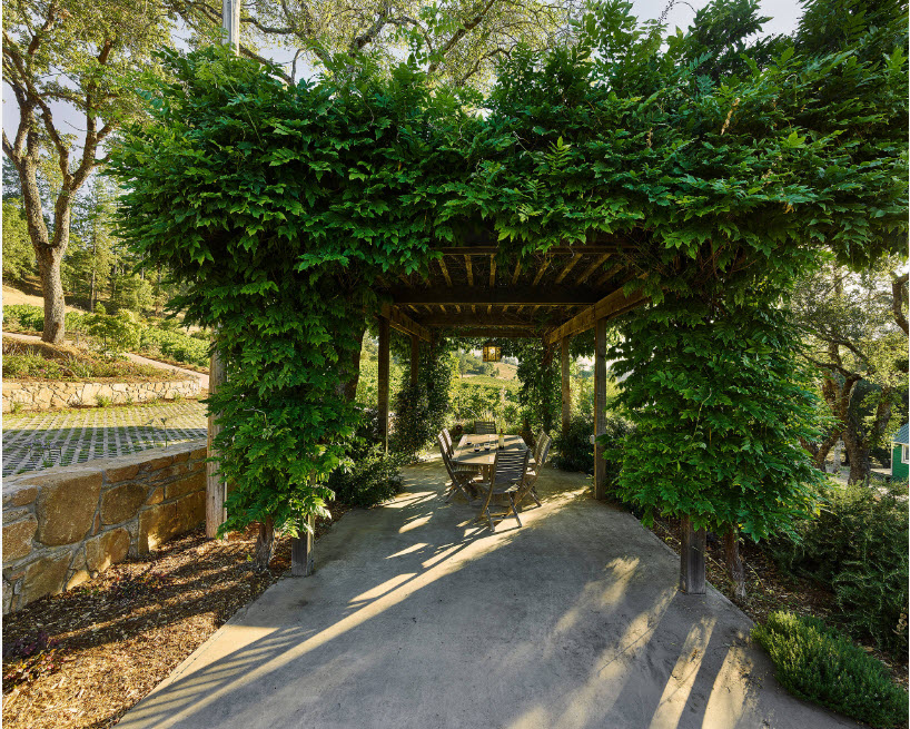 Вход на территорию сада или в зону отдыха можно оформить при помощи опор с вьющимися растениями. Различные арки и перголы также можно ставить возле зоны отдыха или применять в качестве ширмы у построек. Эти элементы дополняются вьющимися растениями: