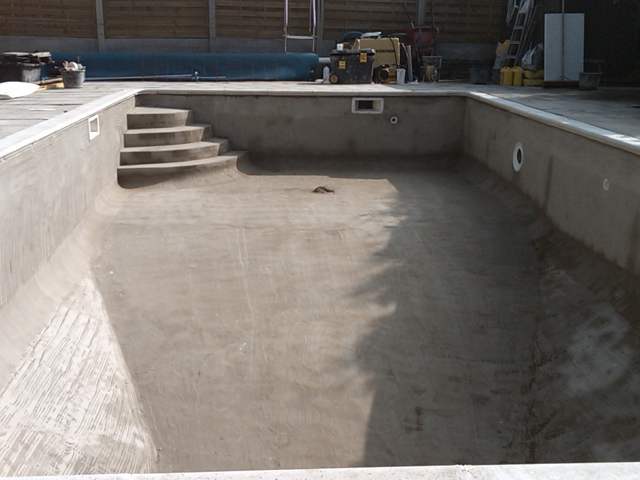 Бетонная лестница монтируется после полного изготовления чаши бассейна. Форма будущей лестницы создается при помощи металлической арматуры и фанеры. Она легко гнется принимая необходимый вид. Можно сколотить опалубку для будущей лестницы из досок. После возведения каркаса, форма заливается. Чтобы исключить растрескивания бетона в жару, он ежедневно поливается водой, до полного просыхания материала.