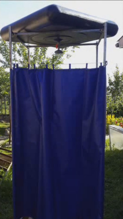 Мешок или лейку можно подвесить просто на дереве, но тогда мыться придётся в купальнике или плавках. Чтобы искупаться полностью, нужно будет соорудить подобие душевой кабины из непрозрачного рулонного материала, например, полиэтиленовой плёнки или полипропиленового (ПП) брезента, который более предпочтителен, так как не липнет к телу.