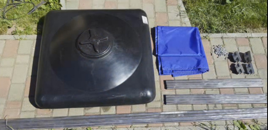 Металлический каркас потребует наибольших затрат, но все равно обойдется намного дешевле кирпича. Для сооружения каркасного душа потребуется: брезентовое полотно (3/5 м), металлический профиль (18 м, 40/25 мм), бак для душа из пластика, желательно черного цвета (объем 50-100 л), лейка для душа, сгон ½ и кран с такой резьбой. Такие детали, как лейка, гайки, сгон, кран, прокладки и шайбы являются очень востребованными материалами, поэтому часто они и продаются одним комплектом, что особенно удобно.