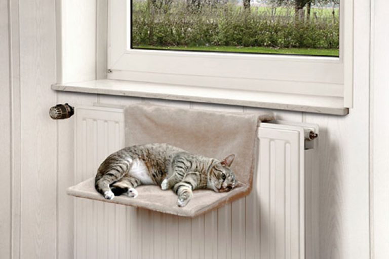 В холодное время года многие домашние коты ищут место рядом с обогревательными приборами. Несложно подвесить полку для кошачьей лежанки на батарею, котику всегда будет тепло и уютно там.