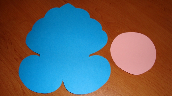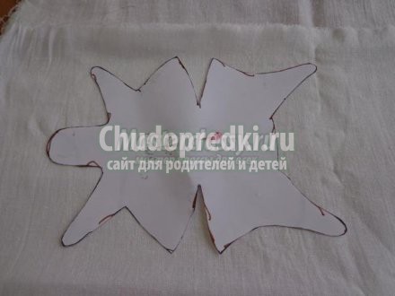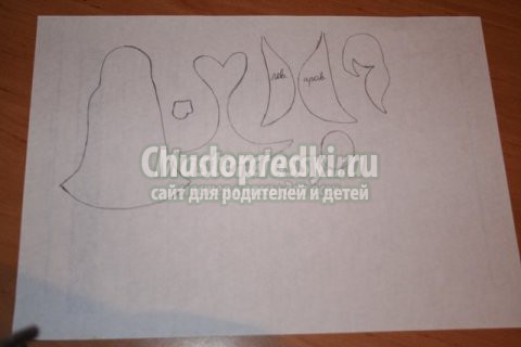 - Также по трафарету необходимо вырезать шапочку, бороду. Шапочку в верхней части придется стянуть тесьмой, таким образом, она получится объемной.