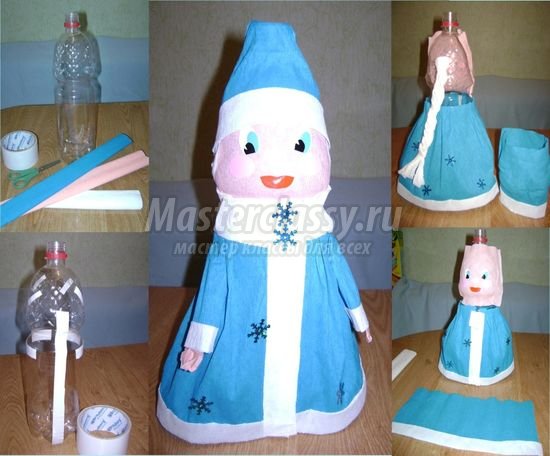 Красивый большой Дед Мороз получается из пластиковых бутылок. Фигурку дедушки можно поставить под елку.