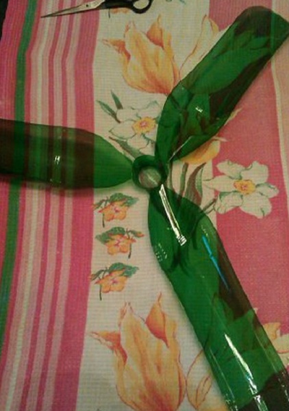 А можно, отрезав горлышки с резьбой, воспользоваться степлером. Или, вставляя бутылочные листья один в один, закрепить на пруте только последний.