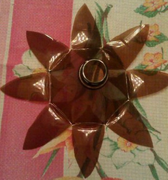 В этом случае коричневые бутылки используются не полностью, а только 1/3 часть (которая у узкой части). Вместо 6 длинных полосок вырезается 8 коротеньких заостренных лепестков.